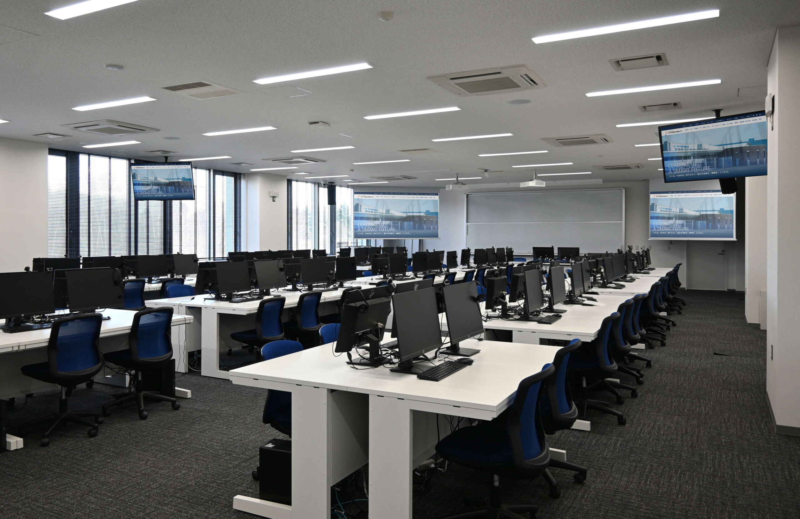 PC教室 100人程度収容可能、正面120インチ電動スクリーン、55インチ天吊りディスプレイ